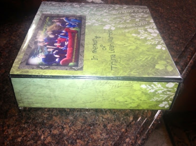 I decided to print off every blog post of Trina's, put them in order from first to last, and make a book of it for Levi. :) It's even completed with a little bookmark ribbon and plastic sheet protectors! I chose green paper for the cover because her blog was green, and that photo was at the top of her blog.